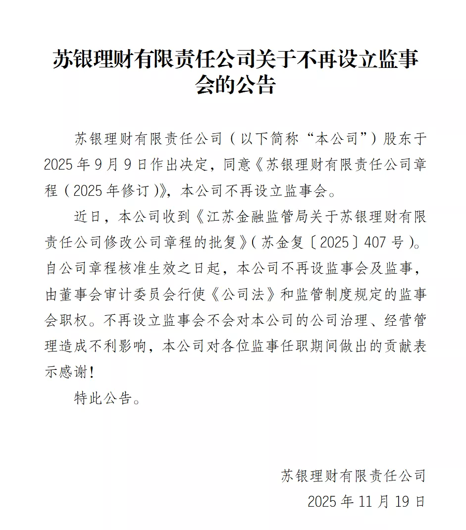 11月24日,苏银理财发布公告称,该公司股东于2025年9月9日作出决定,同意《苏银理财有限责任公司章程(2025年修订)》,公司不再设立监事会。近日,公司收到《江苏金融监管局关于苏银理财有限责任公司修改公司章程的批复》(苏金复〔2025〕407号)。自公司章程核准生效之日起,苏银理财不再设监事会及监事,由董事会审计委员会行使《公司法》和监管制度规定的监事会职权。