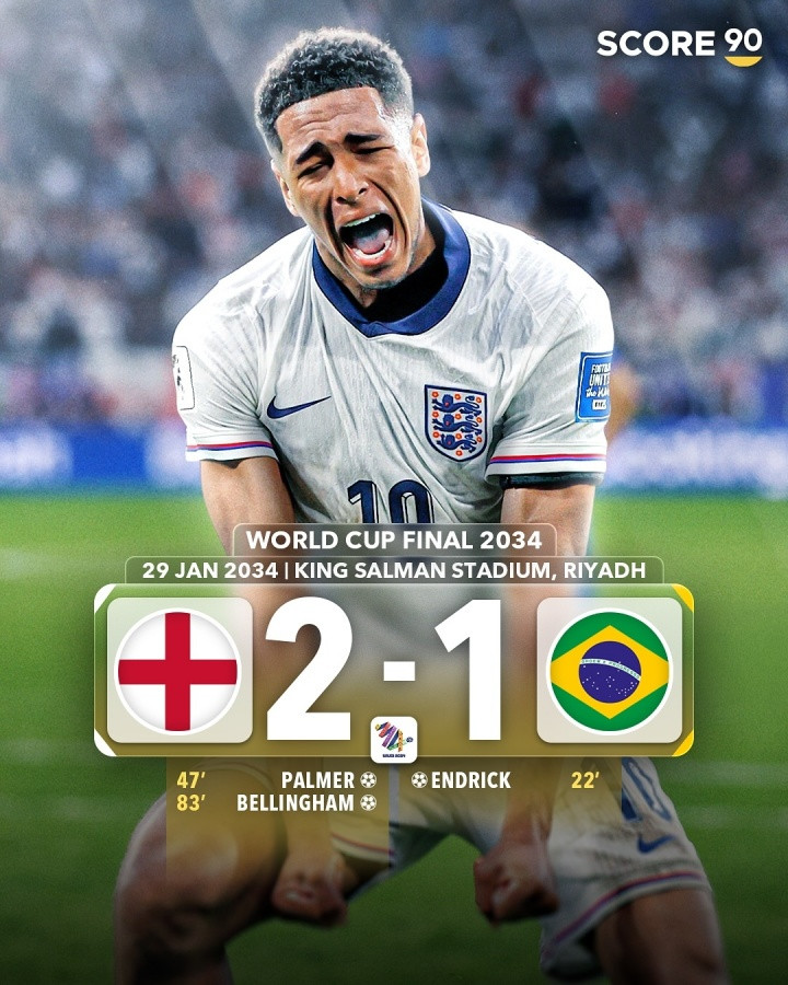 英格兰2-1逆转巴西,恩德里克率先破门,帕尔默扳平比分,贝林厄姆破门完成逆转。