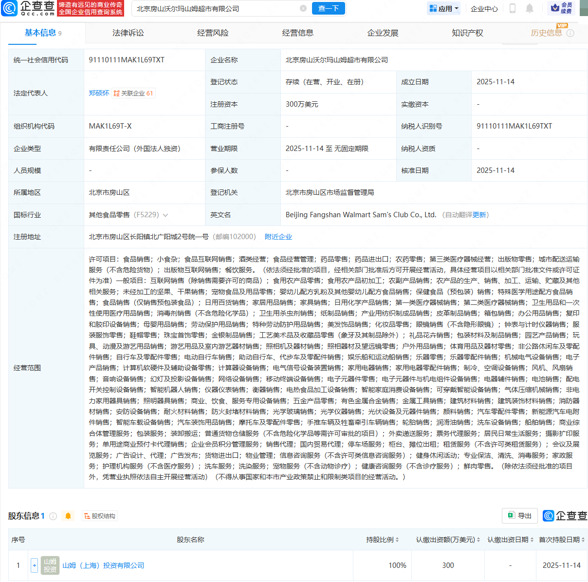 近日股票知识配资论坛,北京房山沃尔玛山姆超市有限公司成立,法定代表人为郑硕怀,注册资本为300万美元,经营范围包含:食品销售;小食杂;食品互联网销售;酒类经营;食品经营管理;药品零售;药品进出口等。企查查股权穿透显示,该公司由山姆(上海)投资有限公司全资持股。