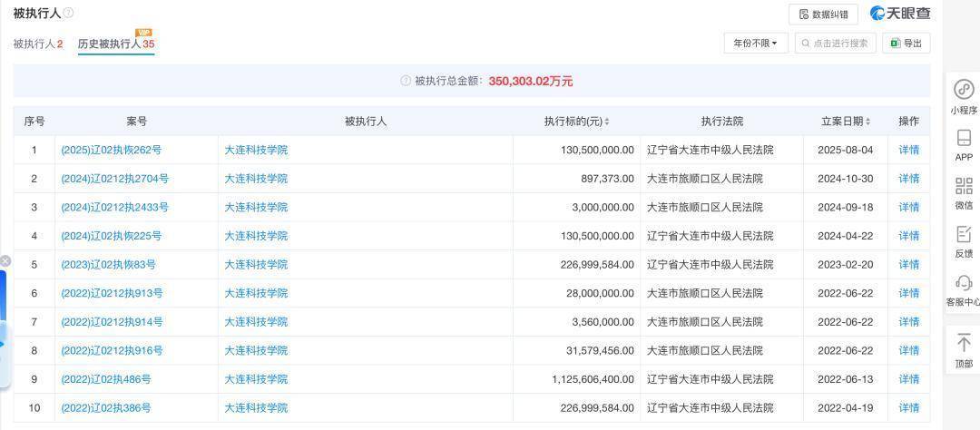 ▲大连科技学院2条被执行人信息,总金额超2.3亿元。